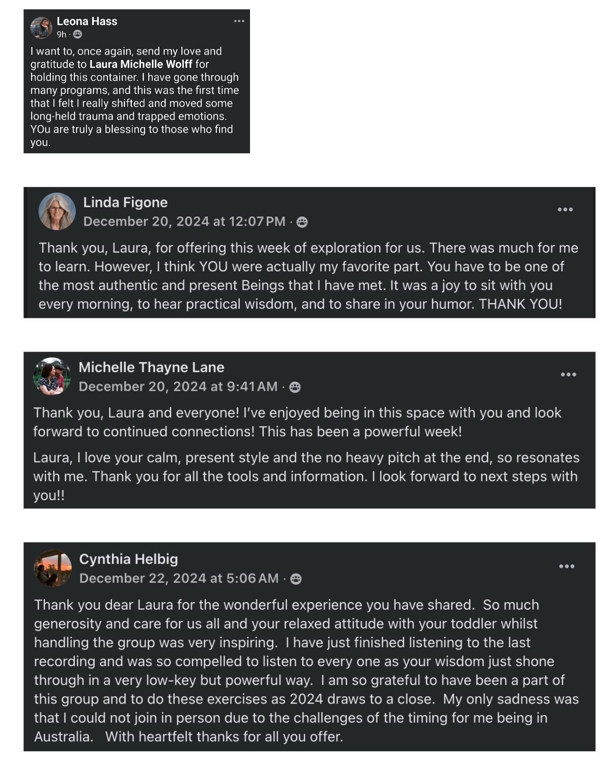 “I just finished a program with Laura Michelle. She has a real gift for creating and holding supportive and inspiring space. She is all soul with a side of sass.” Siobhan N.
